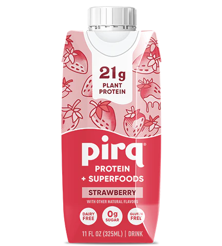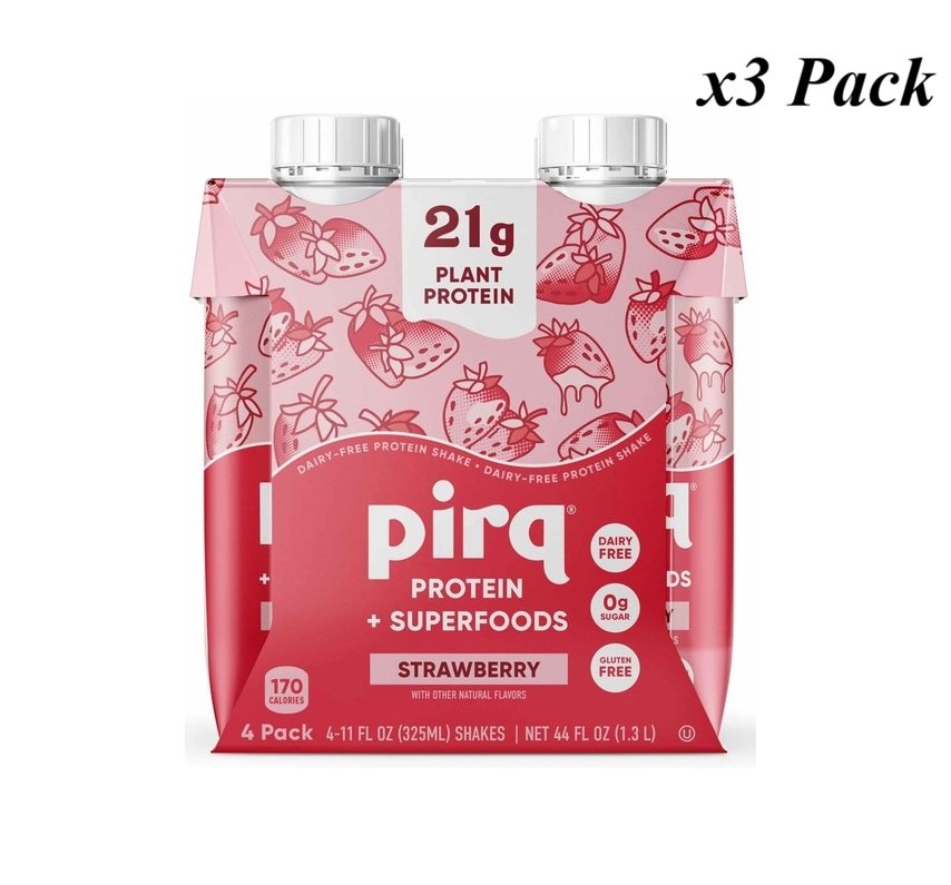 PIRQ 21g Plant Based Protein Shake, 25 Superfoods, STRAWBERRY With other Natural Flavores, 4- 11 FL OZ Shakes (3 pack), Sugar Free (12 COUNT/CASE)