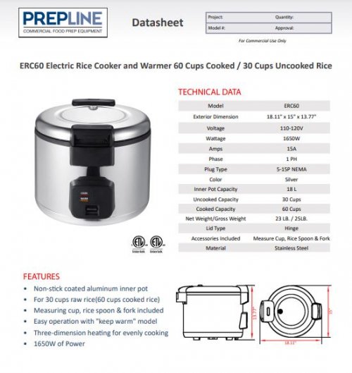 Prepline ERC60 Electric Rice Cooker and Warmer 60 Cups Cooked / 30 Cups Uncooked Rice – 120V/1650W