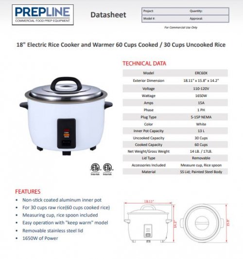 Prepline ERC60X 18″ Electric Rice Cooker and Warmer 60 Cups Cooked / 30 Cups Uncooked Rice – 120V/1650W