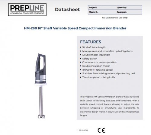 Prepline HM-280 16″ Shaft Compact Immersion Blender – 500W