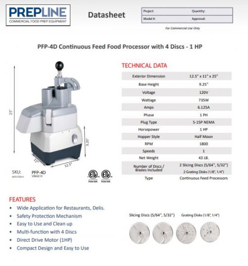 Prepline PFP-4D Continuous Feed Food Processor with 4 Discs – 1 HP