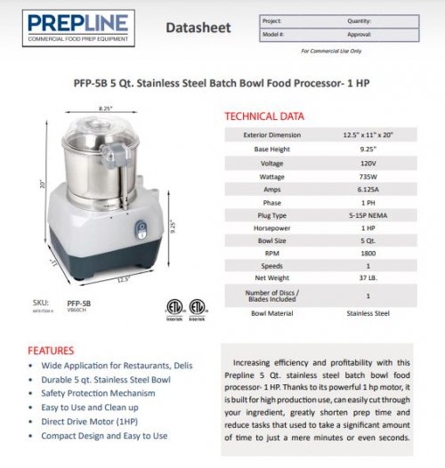 Prepline PFP-3B 3 Qt. Stainless Steel Batch Bowl Food Processor- 1 HP