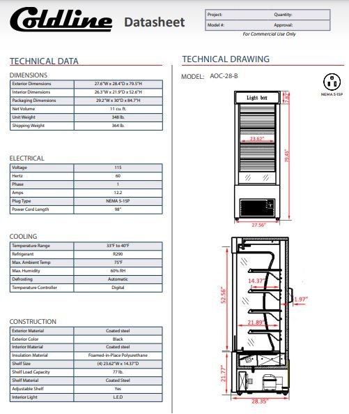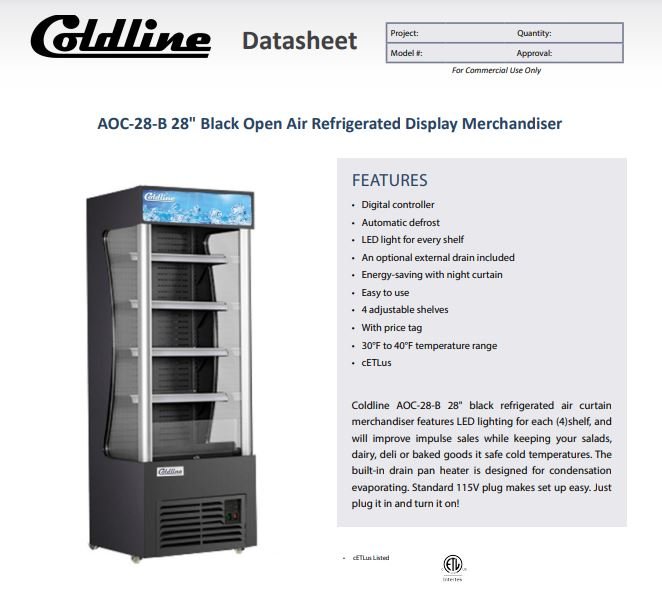 Coldline AOC-28-B 28″ Black Refrigerated Air Curtain Merchandiser features LED lighting for each (4)shelf, and will improve impulse sales while keeping your salads, dairy, deli or baked goods it safe cold temperatures. The built-in drain pan heater is designed for condensation evaporating. Standard 115V plug makes set up easy. Just plug it in and turn it on!