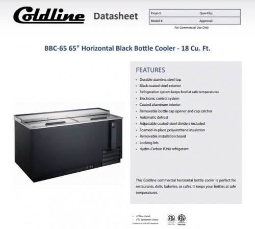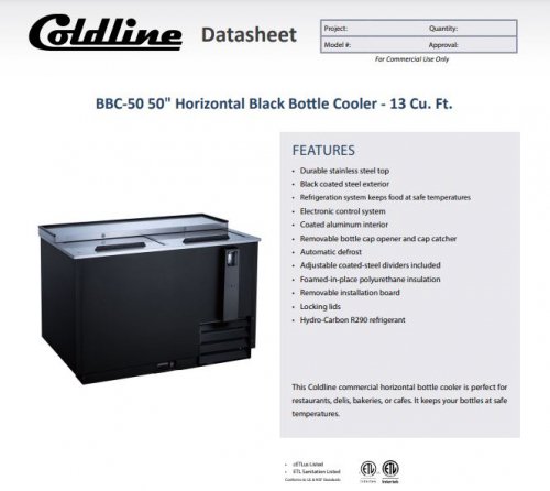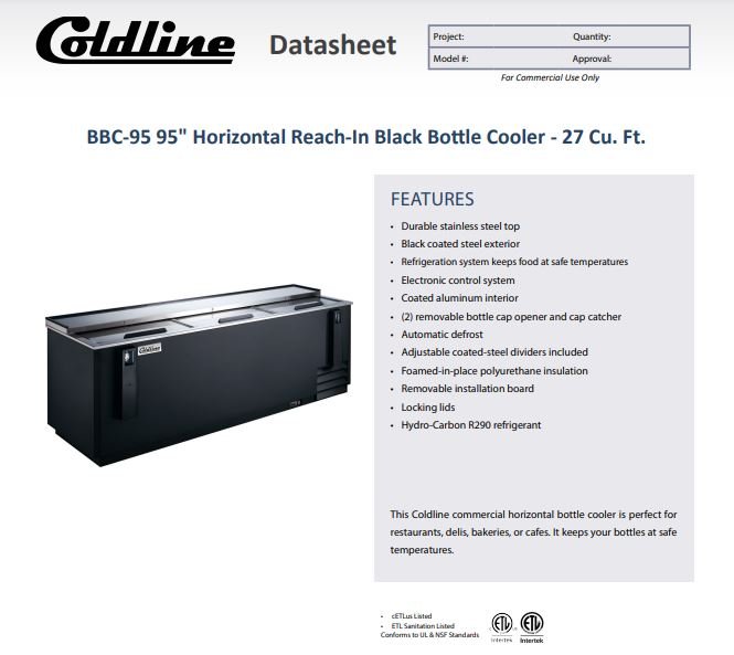 Item: Coldline BBC-95 95″ Horizontal Reach-In Black Bottle Cooler – 27 Cu. Ft.