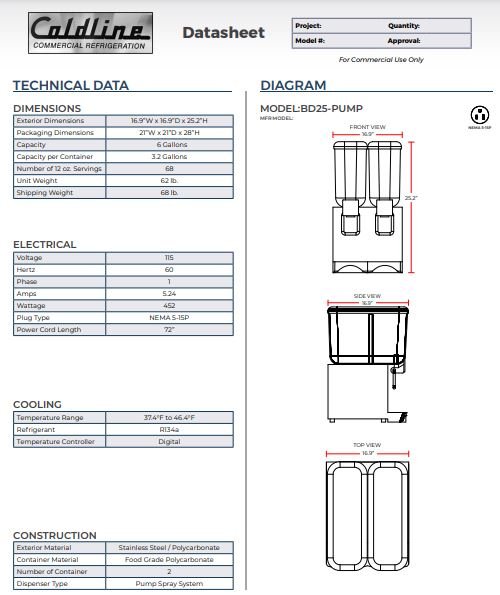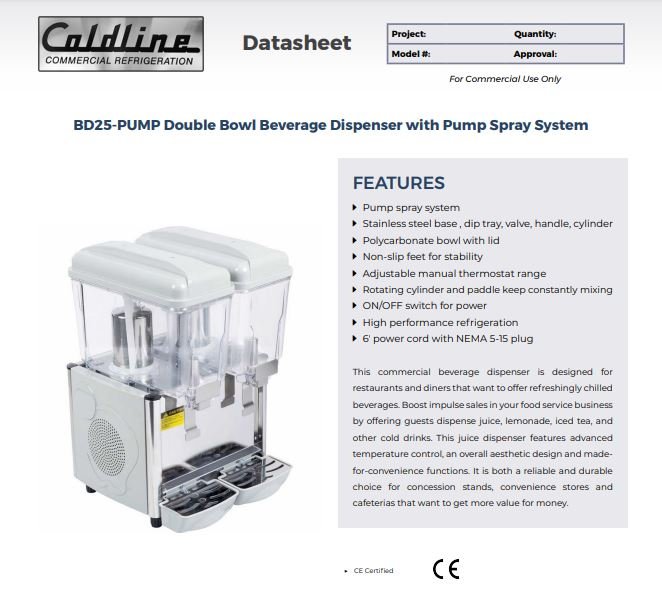 Item: Coldline BD25-PUMP 17″ Double Bowl Beverage Dispenser with Pump Spray System