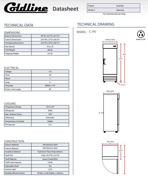 Item: Coldline C-1FE 29? Single Solid Door Reach-In Freezer