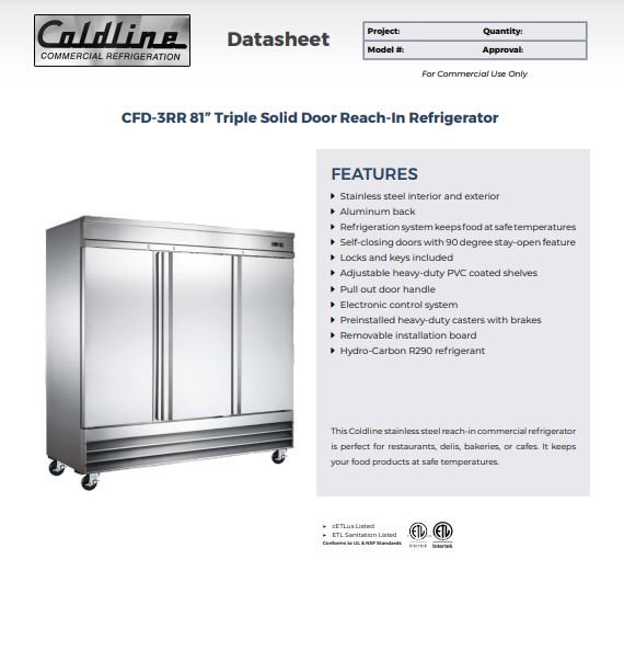 Coldline C-3RR 81-inch Triple Solid Door Reach-In Refrigerator with 72 cubic feet capacity features a heavy-duty stainless steel interior and exterior, ensuring many years of dependability in even the most demanding commercial settings. Insulated self-closing lockable doors allow CFD models to hold safe temperatures in the hottest kitchens. Included are 9 wire shelves with a versatile shelf slide design. Lockable heavy-duty wheels come standard.