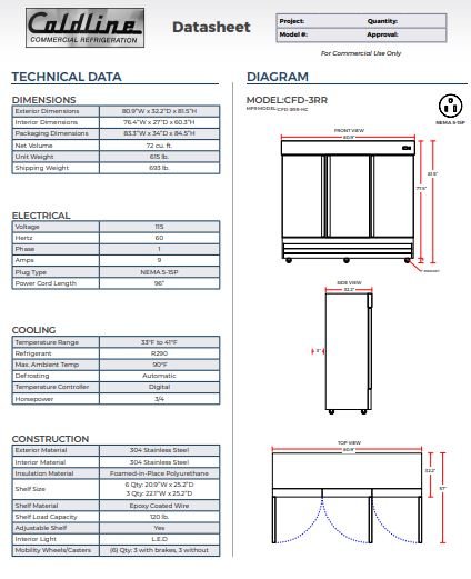 Item: Coldline C-3RR 81-inch Triple Solid Door Reach-In Refrigerator