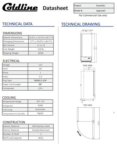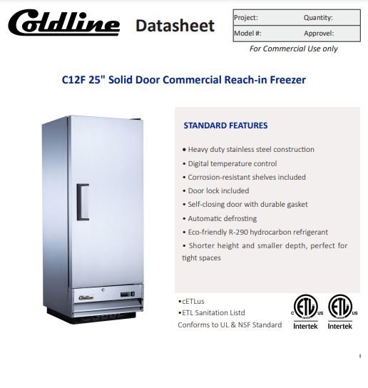 Item: Coldline C12F 25″ Solid Door Commercial Reach-in Freezer-11 Cu. Ft.