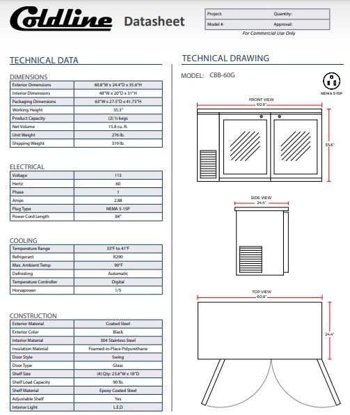 Item: Coldline CBB-60G 60″ Black Counter Height Narrow Glass Door Back Bar Refrigerator