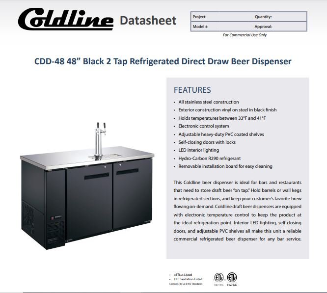 Item: Coldline CDD-48 48? Refrigerated Direct Draw Beer Dispenser with 1 Spout – 11.8 Cu. Ft.