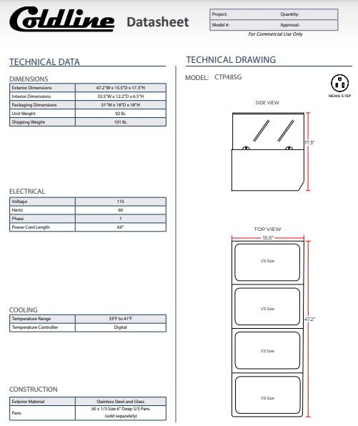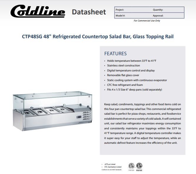Item: Coldline CTP48SG 48″ Refrigerated 4 Pan Glass Top Cover Countertop Salad Bar