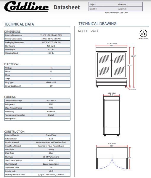 Item: Coldline D53-B 53? Double Glass Swing Door Merchandising Freezer – Black