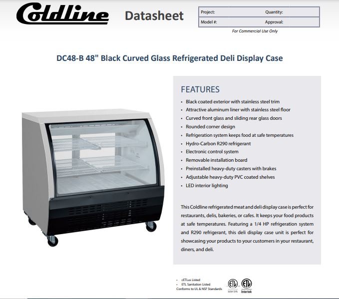 Item: Coldline DC48-B 48″ Black Curved Glass Refrigerated Deli Display Case