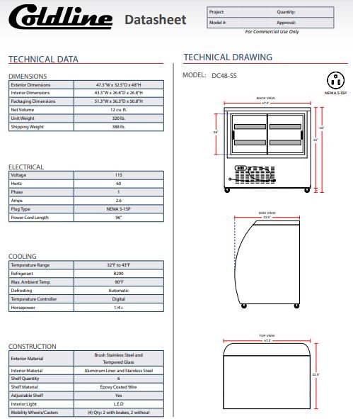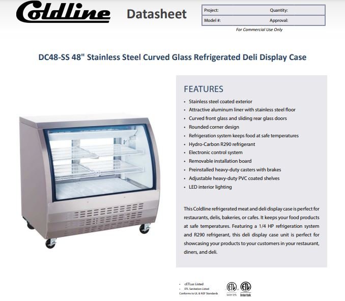 Be the first to review “Coldline DC48-SS 48″ Stainless Steel Curved Glass Refrigerated Deli Display Case”