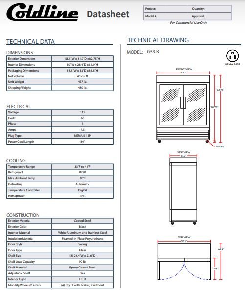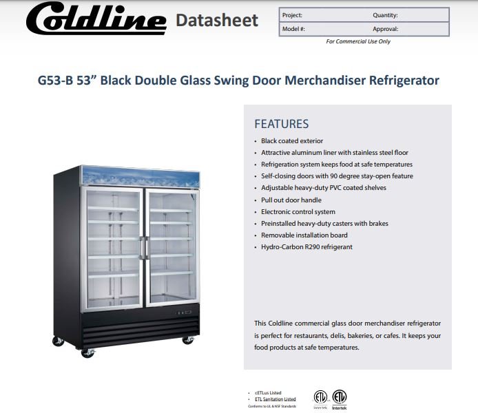 Item: Coldline G53-B 53? Double Glass Swing Door Merchandising Refrigerator – Black