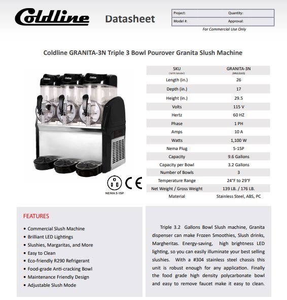 Item: Coldline GRANITA-3N 26″ Triple 9 Gallon Pourover Granita Slush Machine