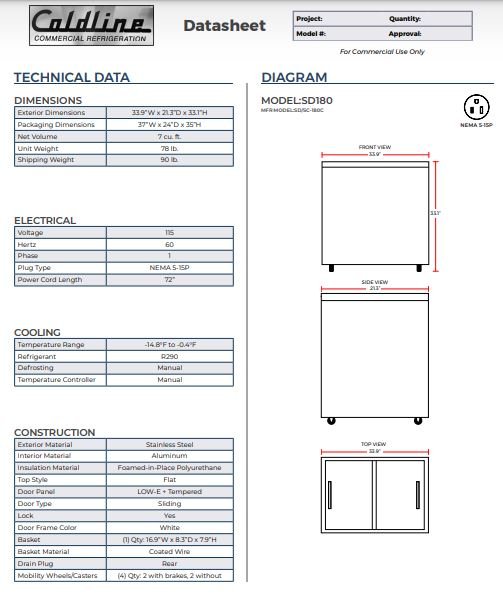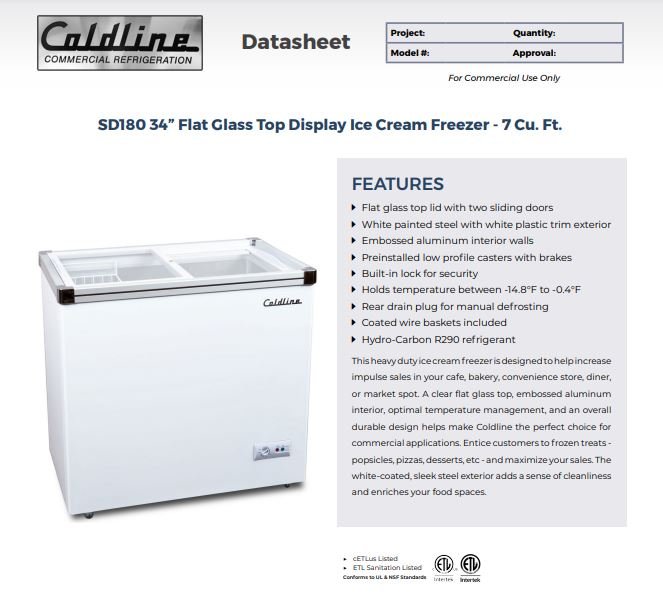 Item: Coldline SD180 34″ Flat Glass Top Display Ice Cream Freezer with 1 Basket, ETL