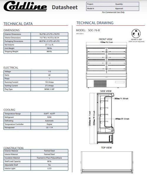 Coldline SOC-76-B 76″ Black Refrigerated Air Curtain Merchandiser features LED lighting for each (8)shelf, and will improve impulse sales while keeping your salads, dairy, deli or baked goods it safe cold temperatures. The built-in condensation evaporating systems means no drain required.