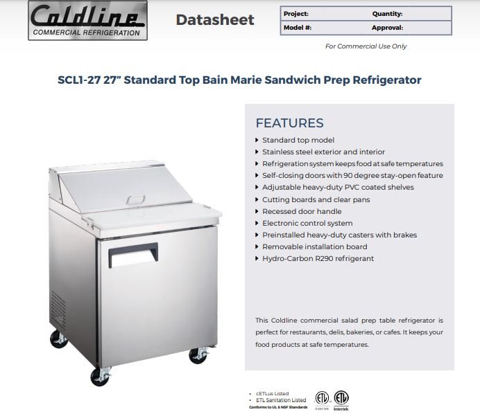Item: Coldline SP27 27″ Bain Marie Sandwich Prep Table – 6 Pans