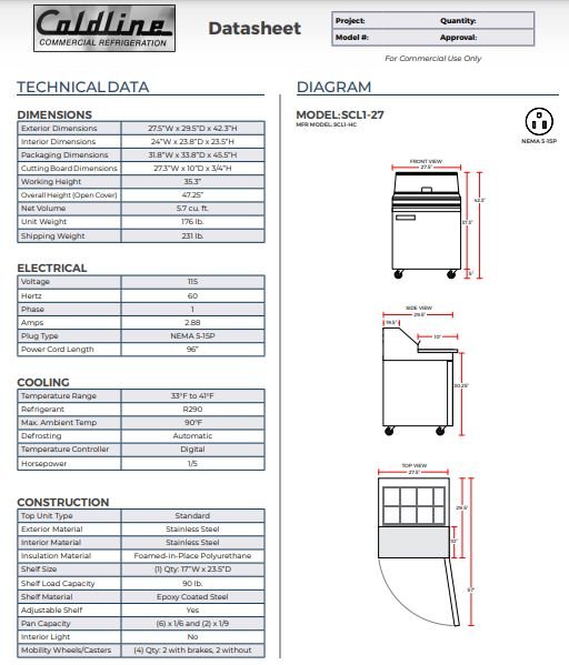 The SP 27″ refrigerated sandwich prep unit fits 6 x 1/6 size pans or 2 x 1/9 size pans. And it features a 10″ deep removable cutting board for easy cleaning, self-closing doors, and an insulated roll top to lock in cold air. The 5.7 cubic feet of storage inside includes an adjustable shelf. The 1/5 HP refrigeration system features auto defrost and is electronically controlled to keep your food in the safe zone. Durable and easy to clean stainless steel construction. The 29.5″ depth makes it a great addition to small kitchens.