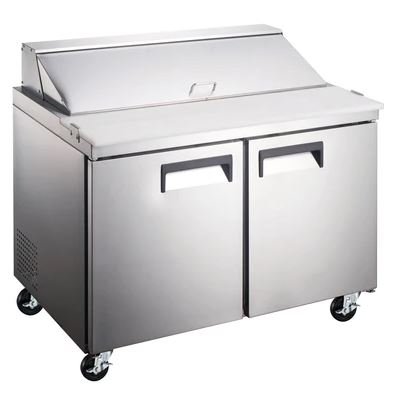 The SP 60″ refrigerated sandwich prep unit fits 16 x 1/6 size pans. Features a 10″ deep removable cutting board for easy cleaning, self-closing doors, and an insulated roll top to lock in cold air. The 15 cubic feet of storage inside includes an adjustable shelf. The 1/4+ HP refrigeration system features auto defrost and is electronically controlled to keep your food in the safe zone. Durable and easy to clean stainless steel construction. The 29.5″ depth makes it a great addition to small kitchens.