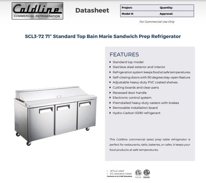 Item: Coldline SP72 71″ Bain Marie Sandwich Prep Refrigerator – 18 Pans