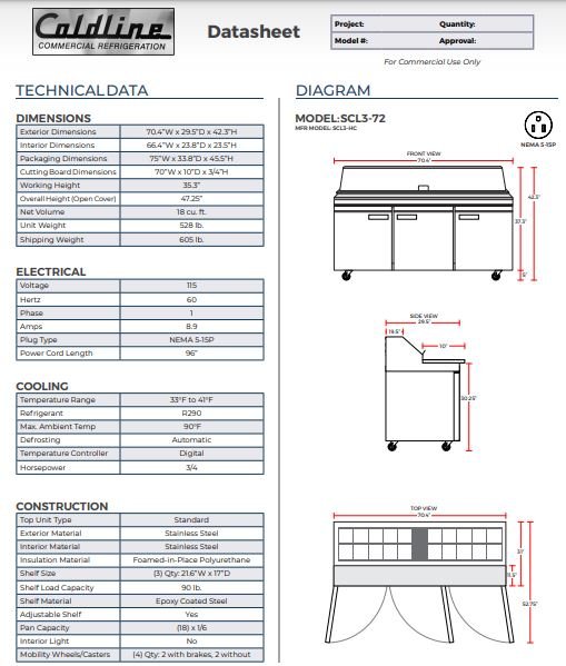 The SP 71″ refrigerated sandwich prep unit fits 18 x 1/6 size pans. Features a 10″ deep removable cutting board for easy cleaning, self-closing doors, and an insulated roll top to lock in cold air. The 18 cubic feet of storage inside includes an adjustable shelf. The 3/4 HP refrigeration system features auto defrost and is electronically controlled to keep your food in the safe zone. Durable and easy to clean stainless steel construction. The 29.5″ depth makes it a great addition to small kitchens.