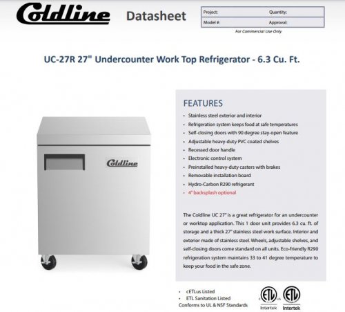 Item: Coldline UC-72R 72? Undercounter Work Top Refrigerator – 15.5 Cu. Ft.