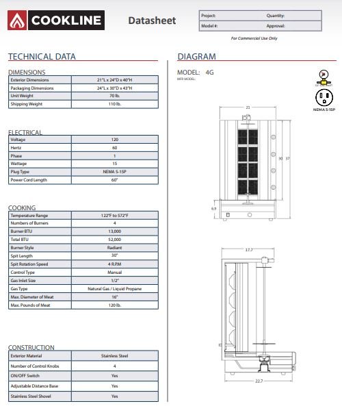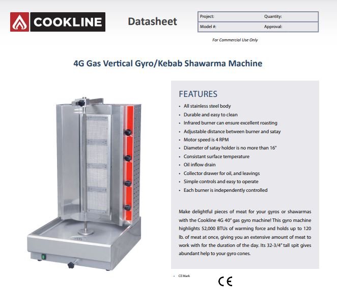 This Cookline 4G Gas Vertical Gyro/Kebab Shawarma Machine features an all stainless steel body, which is durable and easy to clean. The 4G is well equipped with an infrared burner that will ensure excellent roasting of your meats. And the collector drawer for oil, and leavings make cleaning a breeze.