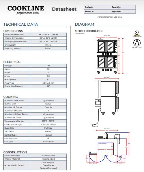 Item: Cookline CC100-DBL 38″ Gas Double Deck Full-Size Convection Oven – 108,000 BTU