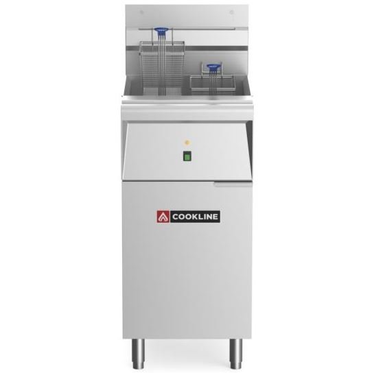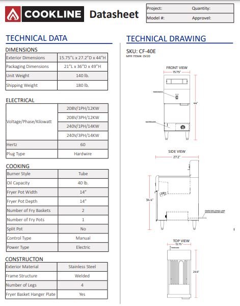 No gas? No problem with Cookline CF-40E-208-3 40 lb. electric floor deep fryer. Designed to be efficient and easy to use, this 15.75″ deep fryer includes a stainless steel fry pot rated for 40 lb. of oil. Two twin baskets are included and the unit can support a single wide basket desired. The built-in thermostat assures quick recovery time. Slanted bottom with drain pipe makes draining and cleaning simple. Units ship pre-wried for 3 Phase but can be converted in the field by your electrical at installation from 3 Phase to Single Phase or Single Phase to 3 Phase. *This unit should be installed by a licensed electrician.