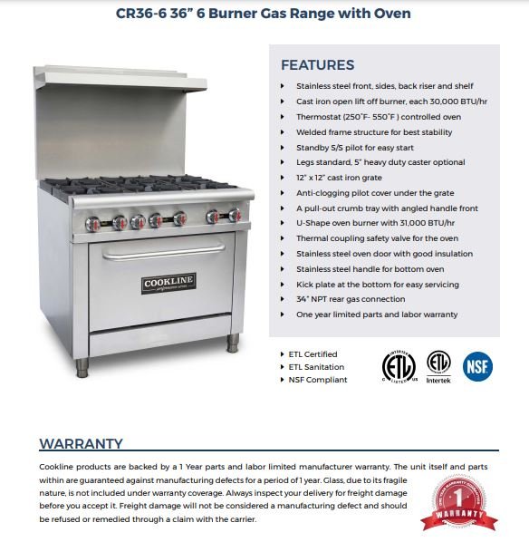 Item: Cookline CR36-6 36″ 6 Burner Gas Range with Oven – 210,000 BTU