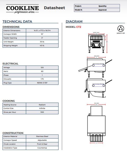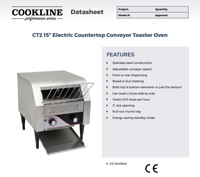 This Cookline CT2 15″ Electric Countertop Conveyor Toaster Oven features stainless steel construction. The adjustable conveyor speed allows you to control the speed and temperature at which your bread/bun is toasted. The CT2 is capable of toasting 300 slices per hour, which can significantly assist in your restaurant’s food prep needs. And a pull-out crumb tray makes disposal of excess crumbs easy.