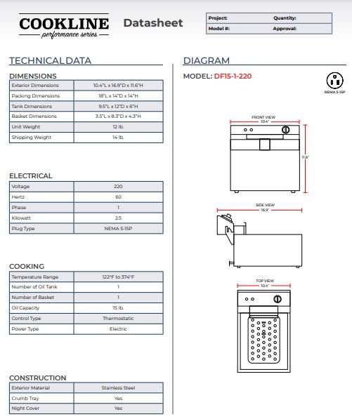 Item: Cookline DF15-1-220 10″ Single Tank 15 lb. Electric Countertop Fryer – 220v