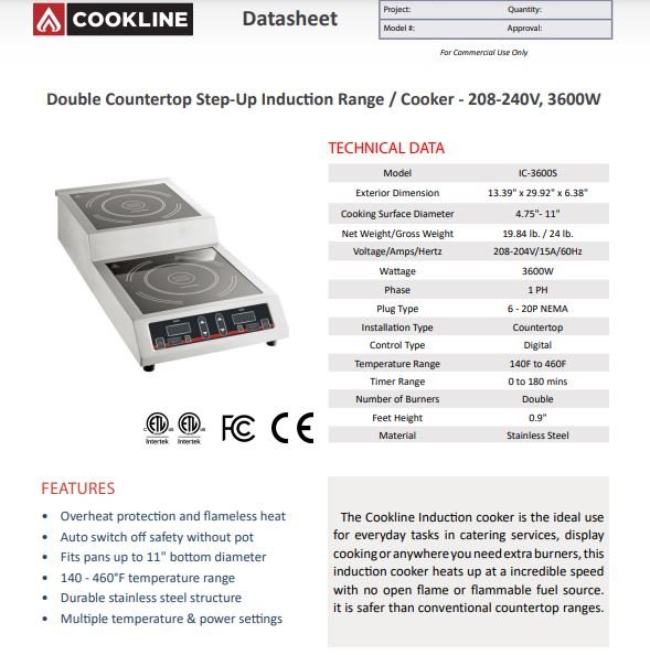 Item: Cookline IC-3600S Double Countertop Step-Up Induction Range / Cooker – 208-240V, 3600W