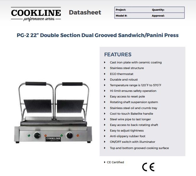 Item: Cookline PG-2 22″ Double Commercial Panini / Sandwich Press, Grooved Surface, 18.5″ x 10″ Cooking Surface, 120v