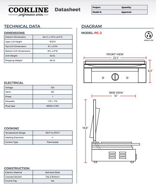 This Cookline PG-2 22″ Single Section Dual Grooved Sandwich/Panini Press features a stainless steel structure and allows for double the sandwich grilling thanks to the dual section design. Temperature range of 120 degrees to 570 degrees Fahrenheit will enable you to get an excellent grilled panini or sandwich. And a stainless steel oil and crumb tray allow for easy removal of excess crumbs.
