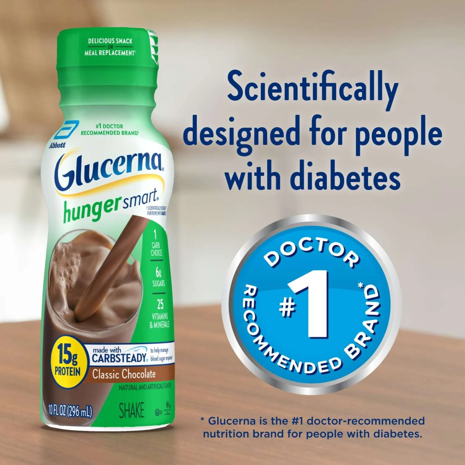 Glucerna Hunger Smart Diabetes Care Shake, Classic Chocolate, Diabetic Meal Replacement to Support Blood Sugar Management, 15g Protein, 180 Calories, Ready to Drink, 10 Fl Oz, 24 Pack
