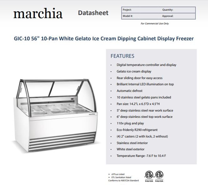 The Marchia refrigerated ice cream gelato display freezer includes LED lighting and10 stainless steel pans as well a user accessible digital temperature controller. Insulated sliding rear doors provide employee access.