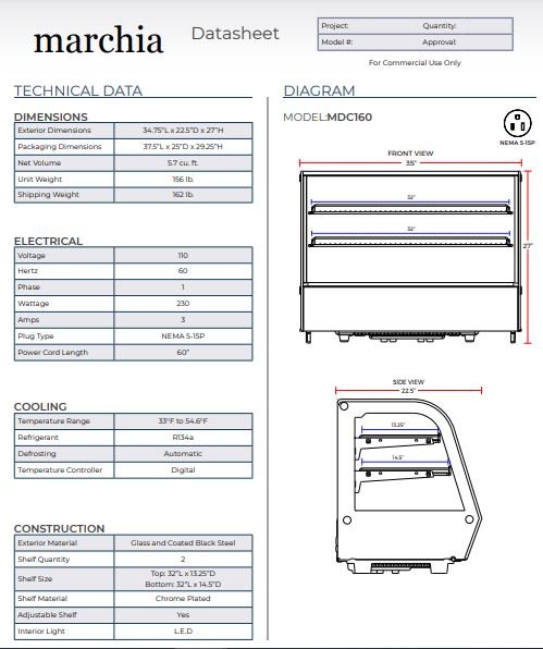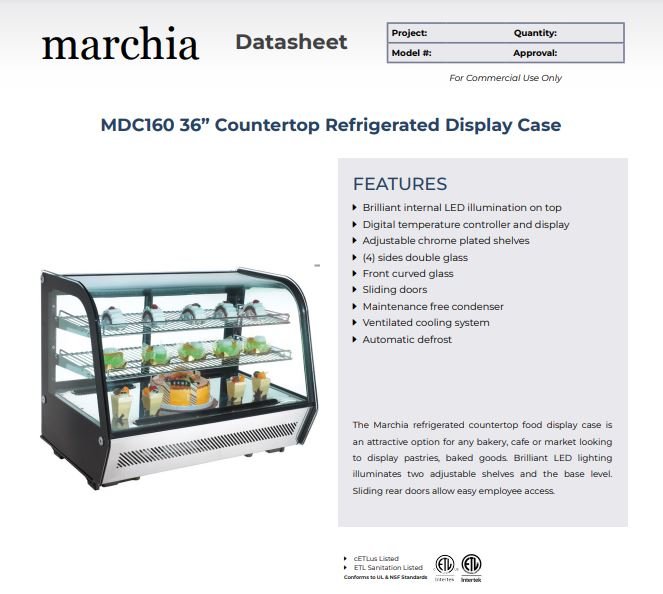 Item: Marchia MDC160 36″ Refrigerated Countertop Bakery Display Case with LED