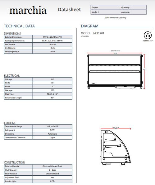 The MDC201 is a 48″ refrigerated countertop display with a stainless steel front and curved glass for excellent viewing angles. As with all Marchia cases, LED lights are standard, and the shelves are adjustable. This refrigerated case holds 33?F to 54.6?F, perfect for bakeries, delis, cafes, and markets. The insulated rear sliding doors allow easy employee access. The case is straightforward to use, just unbox, plug-in, and turn on!