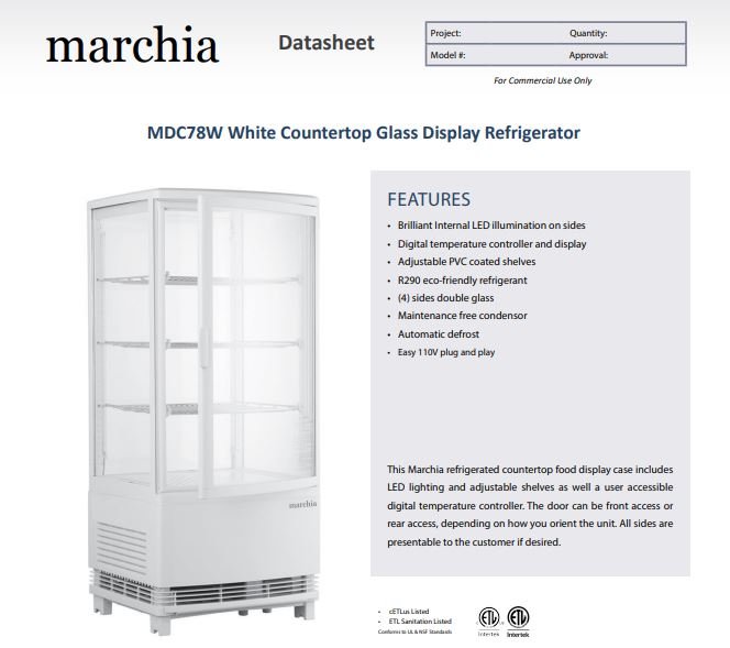 Item: Marchia MDC78W White Countertop Refrigerated Glass Display Case with LED Lighting