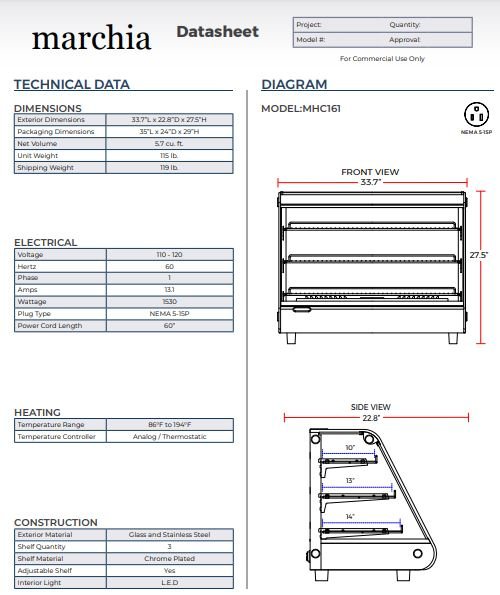 The Marchia MHC161 34? heated countertop display case is perfect for keeping your baked goods fresh. The brilliant internal LED illumination on top helps vibrantly display your baked goods or other food products. And the adjustable temperature controller makes it easy to keep your products at the correct temperature.