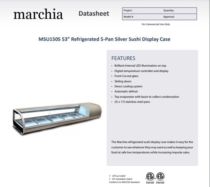 Item: Marchia MSU150S 53″ Refrigerated 5-Pan Sushi Display Case, Silver