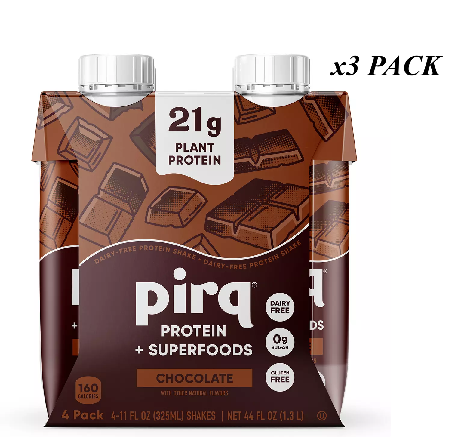 ITEM: PIRQ 21g Plant Based Protein Shake, 25 Superfoods, Chocolate, 4- 11 FL OZ Shakes (3 pack), Sugar Free (12 COUNT/CASE)