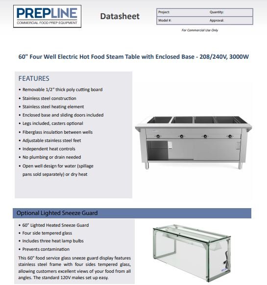Item:Prepline 60″ Four Well Electric Hot Food Steam Table with Enclosed Base and Sliding Doors – 208/240V, 3000W