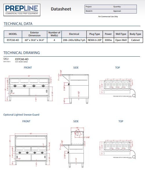 Prepline ESTC60-4O 60″ Four Pan Electric Hot Food Steam Stainless Steel table with Enclosed Base and Sliding Doors, 208/240V