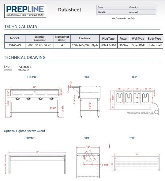 Prepline EST60-4O 60″ Four Pan Electric Hot Food Steam Stainless Steel table with undershelf, 208/240V
