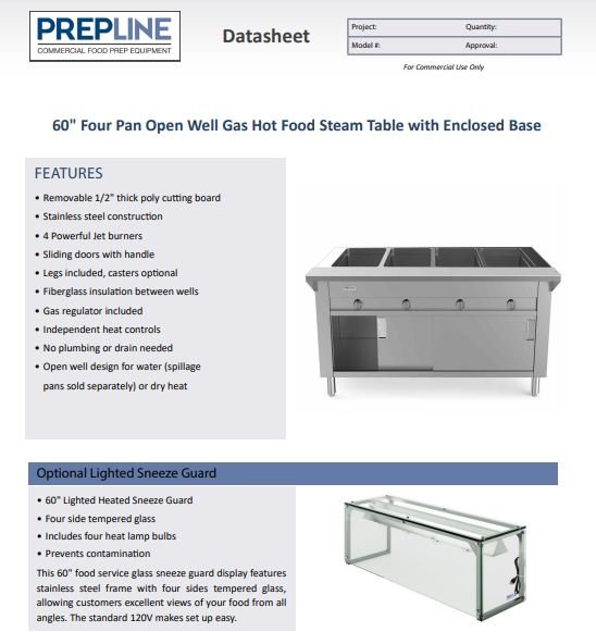 Prepline 60″ Four Well Gas Hot Food Steam Table with Enclosed Base and Sliding Doors